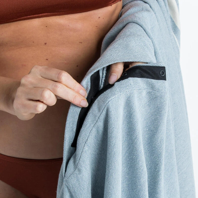 Fonction PONCHO « chauve souris », protégeant bien de la nudité, en ouvrant les boutons pressions du centre de la serviette pour permettre le passage de tête.